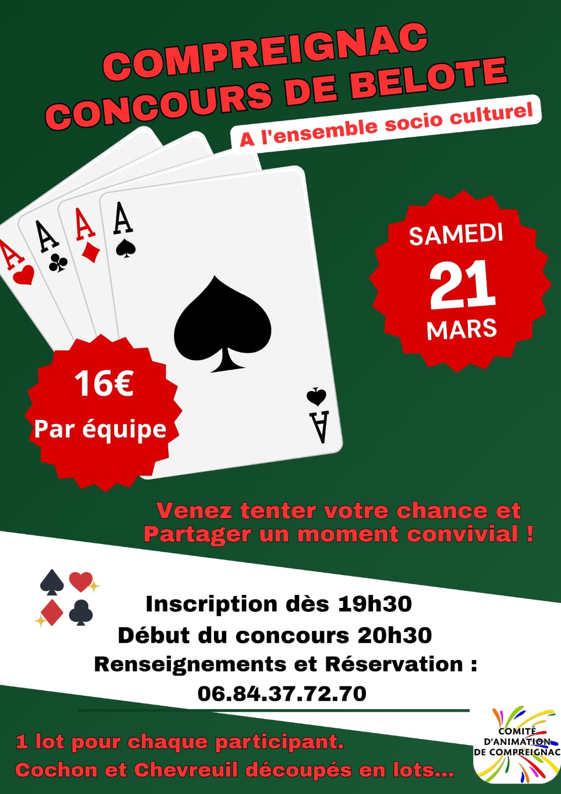 Venez tenter votre chance et partager un moment convivial autour d’une partie de belote !1 lot pour chaque participant. Ambiance chaleureuse garantie. Ouvert à tous les amateurs de cartes. Que vous soyez joueur confirmé ou simple passionné, c’est l’occasion idéale de passer un bon moment entre amis ou en famille. Préparez vos atouts !