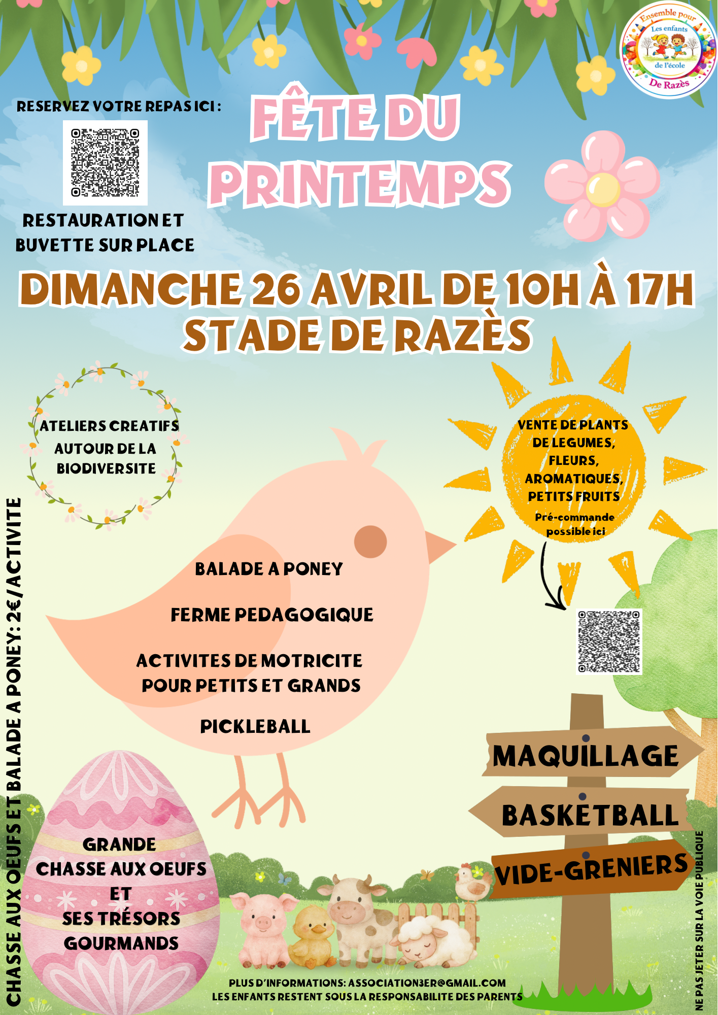 Venez profiter de la fête du printemps organisée par l'association des parents d'élèves de l'école de Razès! Chasse aux œufs, vide-greniers, vente de plants de légumes fleurs et aromatiques, balades à poney, ferme pédagogique, activités de motricité pour petits et grands, activités créatives autour de la biodiversité, basket, pickleball, maquillage.